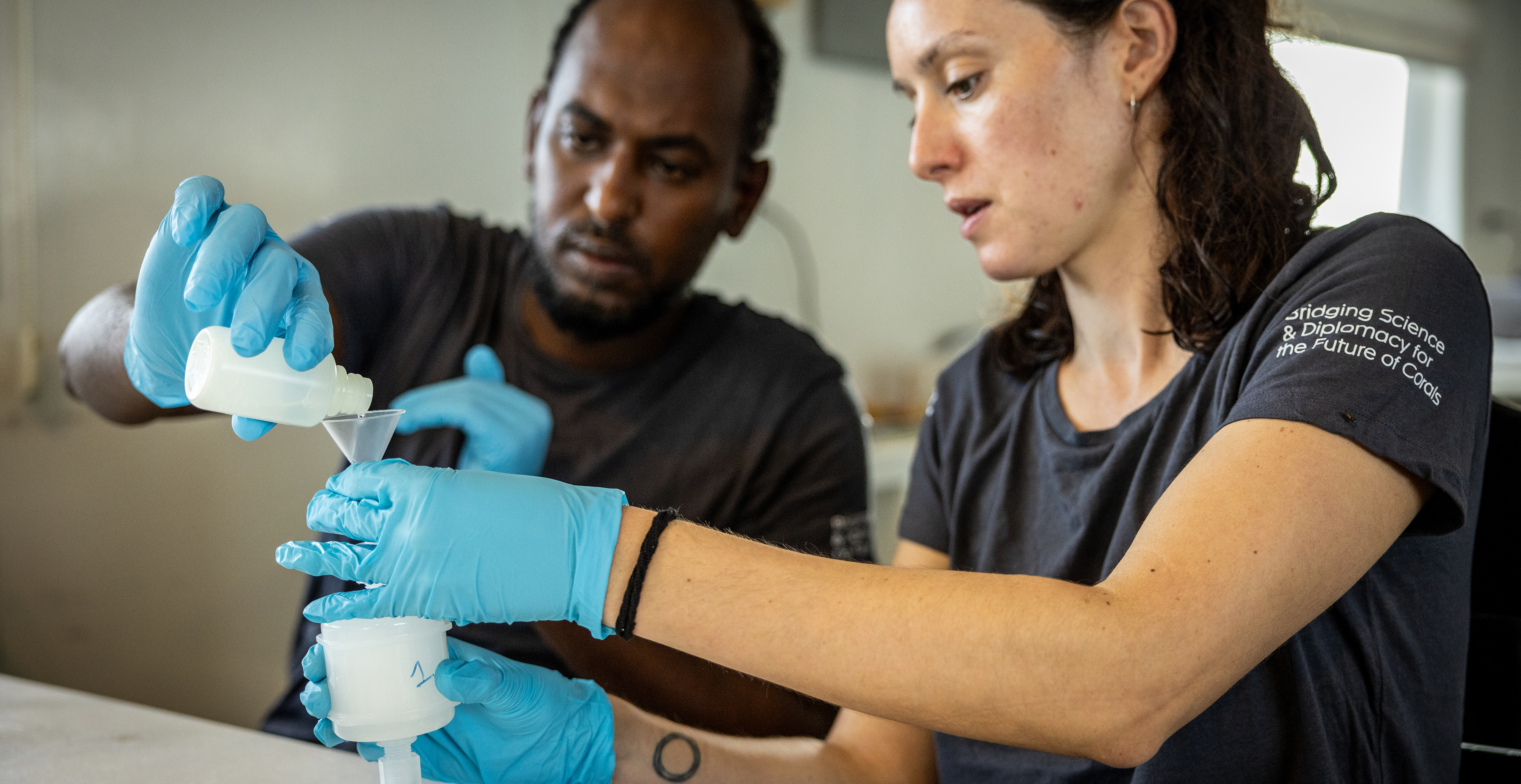 Mustapha Khalafallah (left) and Prof Osama Saad (right) of the Red Sea University in Port Sudan, together with Prof Anders Meibom, director of the TRSC, preserving coral fragments in pure alcohol.